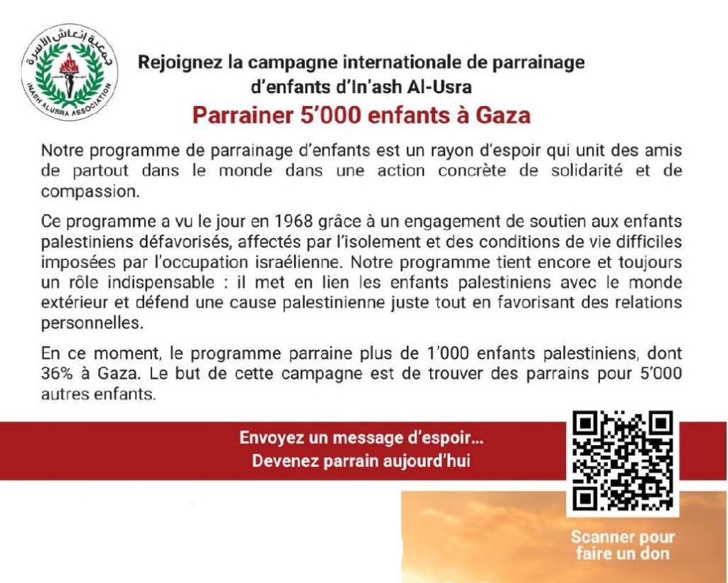 Depuis 2015, en collaboration avec In’Ash Al-Usra et Palestine Women Union, nous parrainons aussi des enfants de Gaza. «A travers l’enfant orphelin de son père et de sa terre, c’est la Palestine à venir que nous soutenons.»