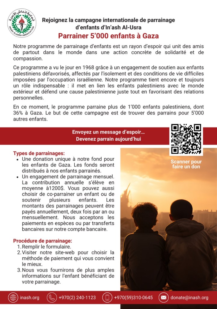 L’Association Parrainages d’enfants de Palestine se propose de faire l’intermédiaire pour cette campagne initiée par In’Ash Al-Usra